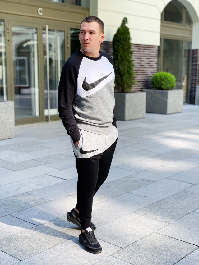 Чоловічі спортивні штани Nike виконані з бавовни та синтетики. Оригінальна сіро-чорне забарвлення виділить вас з натовпу. Спереду на правій штанині розташований чорний «свуш» Nike. З боків розташовані дві кишені. До низу штани звужуються і мають манжети. Ззаду розташований додатковий кишеню.